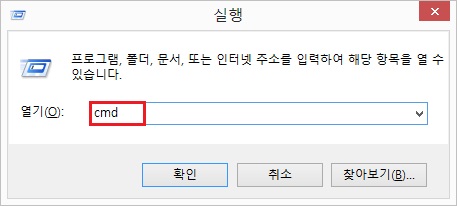 2. 실행 창이 나오면 cmd 라고 입력하고 엔터(Enter)를 칩니다.