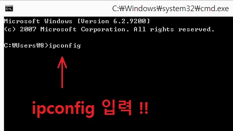3. 검은 색 명령 프롬프트 화면이 나오면 ipconfig 입력, 앤터(Enter)를 칩니다.