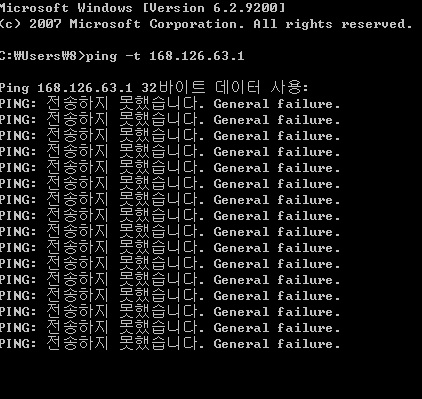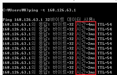 5. 신호가 잘 나가는지 확인을 위해서 ping -t 168.126.63.1 입력후, 앤터(Enter)를 칩니다.