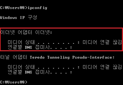 인터넷 선 (LAN Cable)이 빠졌거나 접지 상태가 불량하면 이더넷 어댑터 이더넷 항목에 미디어 연결 끊김이라고 표시됩니다.