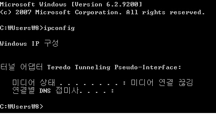 랜 카드 및 랜 드라이버의 설정에 문제가 있는 경우, 이더넷 어댑터는 안보이고, 터널 어댑터만 보이게 됩니다.